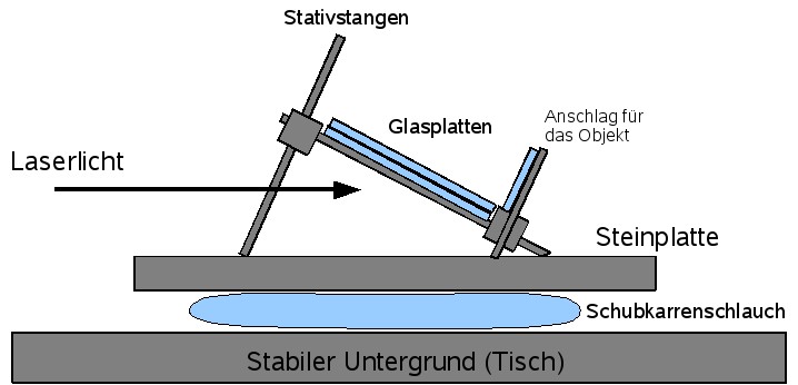 Anschließend baut man die Stativstangen als eine Art Keil auf. Auf den Längsstangen werden dann die Glasplatten aufgelegt (Hier wird später der Film eingelegt. Eine Muffe am unteren Ende bildet den Anschlag). Der Winkel zwischen der Steinplatte und den Glasplatten sollte ungefähr 33 Grad betragen, die genaue Einstellung geschieht später mit dem Laserlicht.