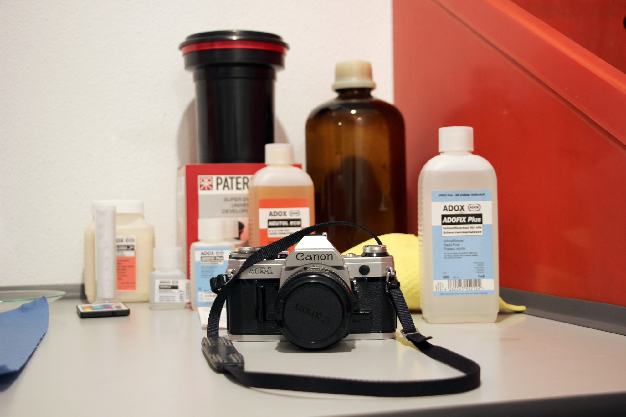 Vor ein paar Wochen haben wir versucht, "2D" Schwarz-Weiß-Film selbst zu entwickeln. Wir haben dafür bei Fotoimpex Berlin Film und ein Entwickler-kit bestellt. Leider haben wir den Fehler gemacht, den Film bei schwachem roten Licht in die Patterson-Dose einzuspulen. Es gibt wohl Filme, die da unempfindlich sind - unserer gehörte nicht dazu... Also bald das Ganze nochmal, hoffentlich klappt es diesmal!
