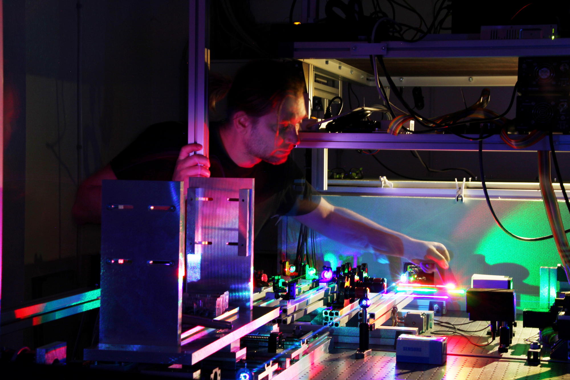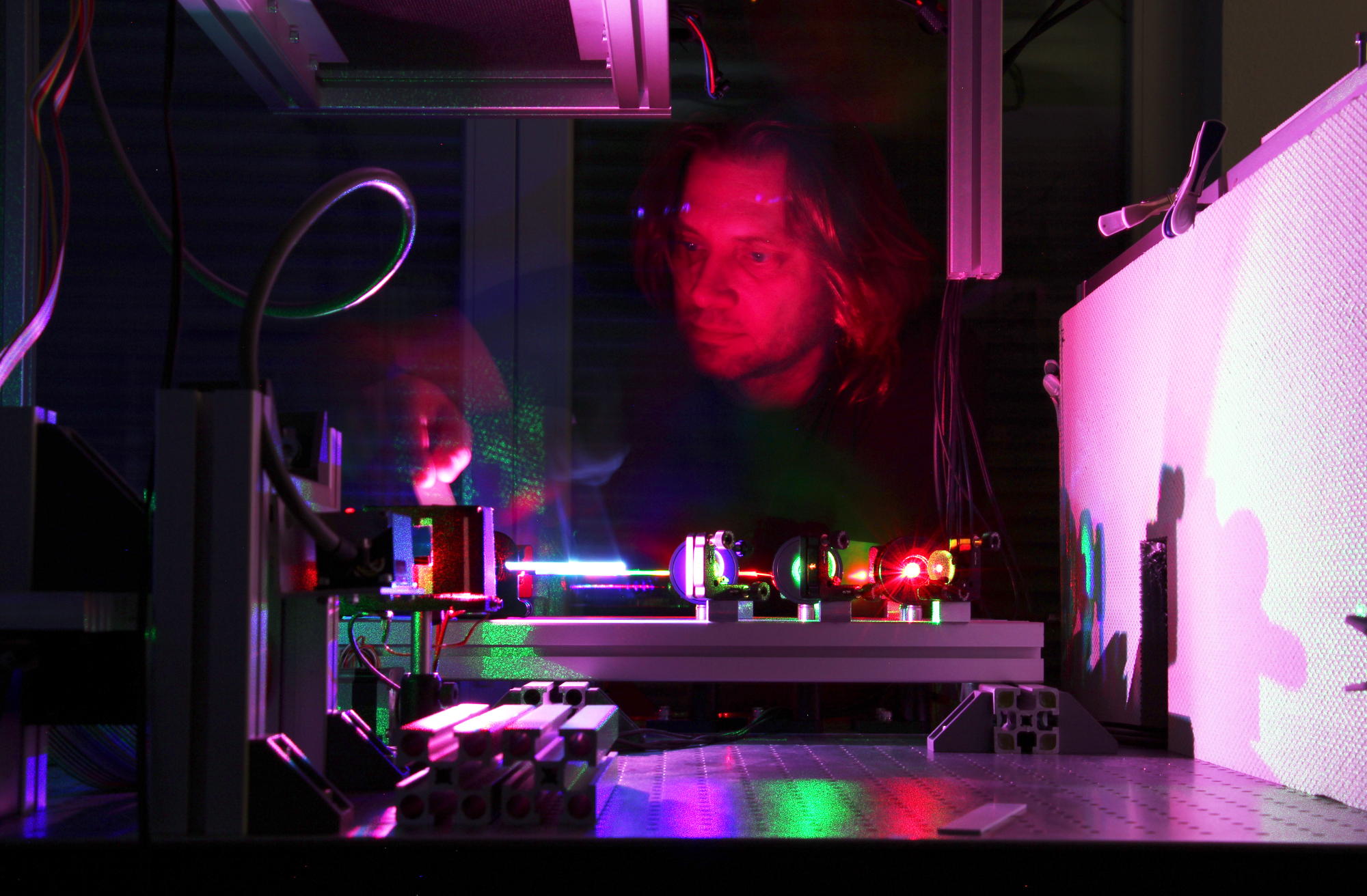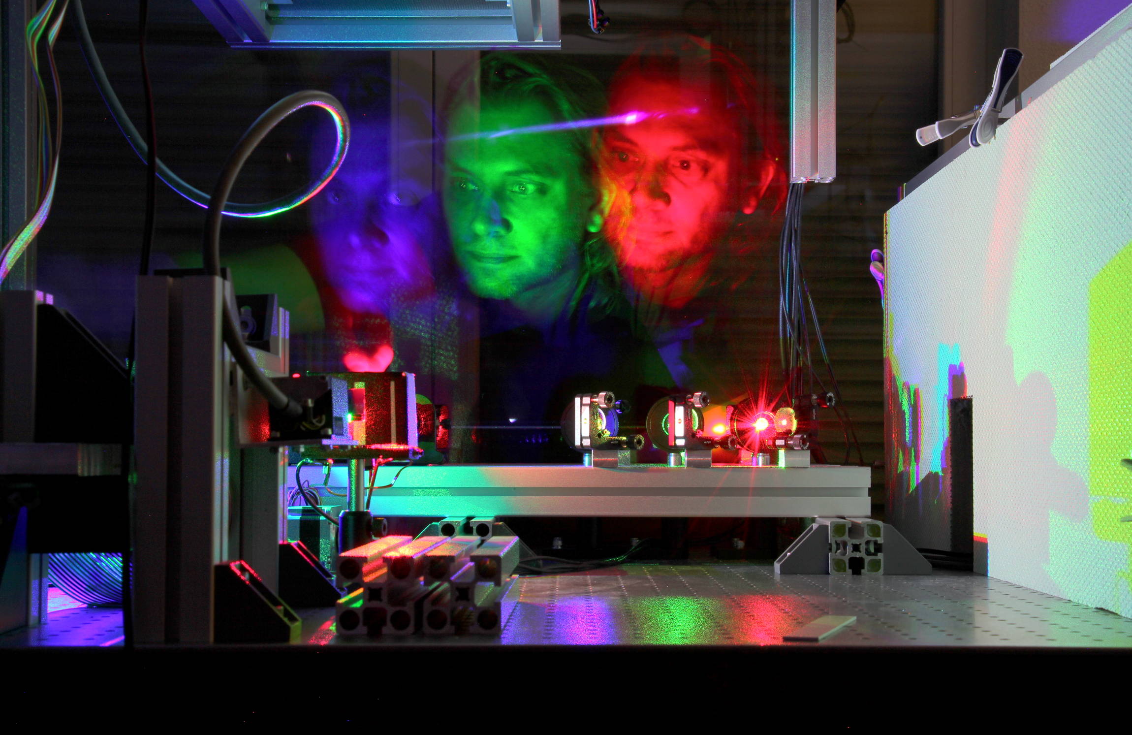 Bei der ersten und letzten Aufnahme hat Marcus Werner nacheinander mit einem Stück schwarzer Pappe die Laserstrahlen unterbrochen, um die verschiedenen Farben sichtbar zu machen. Im zweiten Bild erscheint auch sein Gesicht in unterschiedlichen Farben - für dieses Foto hat er vor dem Unterbrechen des Farblasers seine Position geändert und musste eine Weile stillhalten.