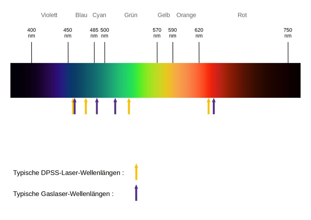 Geeignete LaserBei der Auswahl des passenden Lasers sollte vor allem die nötige Leistung für die Belichtung des Films berücksichtigt werden. Für die Belichtung des Polymers auf den 52 mm x 76 mm Filmplatten sind Laser ab etwa 100 mW Leistung sinvoll. Die Farbe des Lichts, das ein Laser emittiert, ist abhängig von der Wellenlänge. Schreibt man ein Reflexionshologramm mit einem Nd:YAG-Laser, der mit einer Wellenlänge von 532 nm im grünen Beriech liegt, wird es nach der Aufnahme im Weißlicht auch mit dem grünen Anteil des Lichts rekonstruiert. Farbechte Hologramme können mit drei Lasern im jeweils roten, grünen und blauen Bereich hergestellt werden, die Komplexität eines solchen Aufbaus übersteigt jedoch den Zweck dieser Anleitung. Verschiedene Laser-Modelle, die für die Bildholografie interessant sind, emittieren fest definierte Wellenlängen im sichtbaren Bereich des Lichts. Für die Bildholographie kommen drei Laser-Typen in Frage: Dioden-Laser, Festkörper-Laser (Diode Pumped Solid State, DPSS) und Gaslaser: Diodenlaser