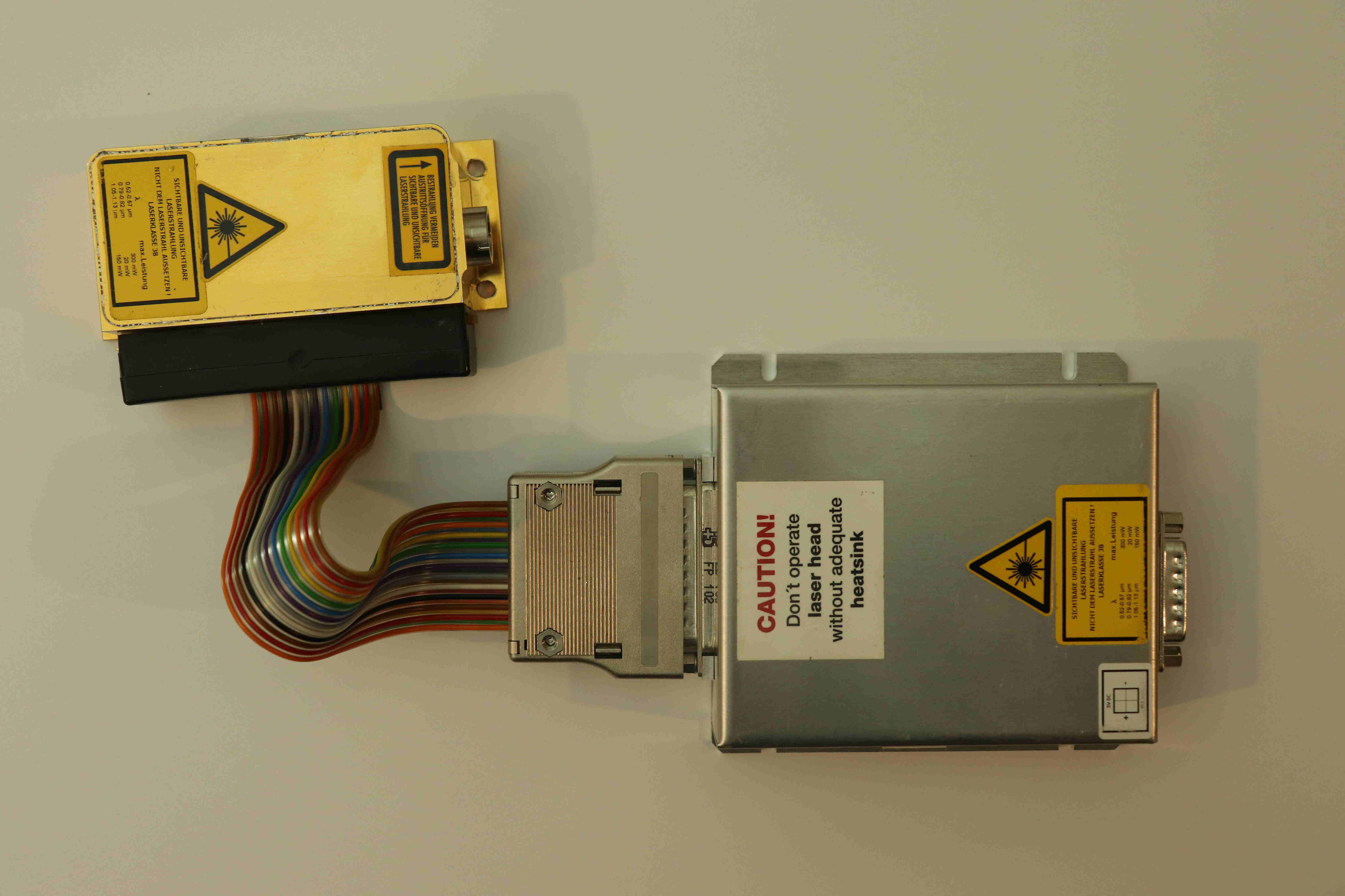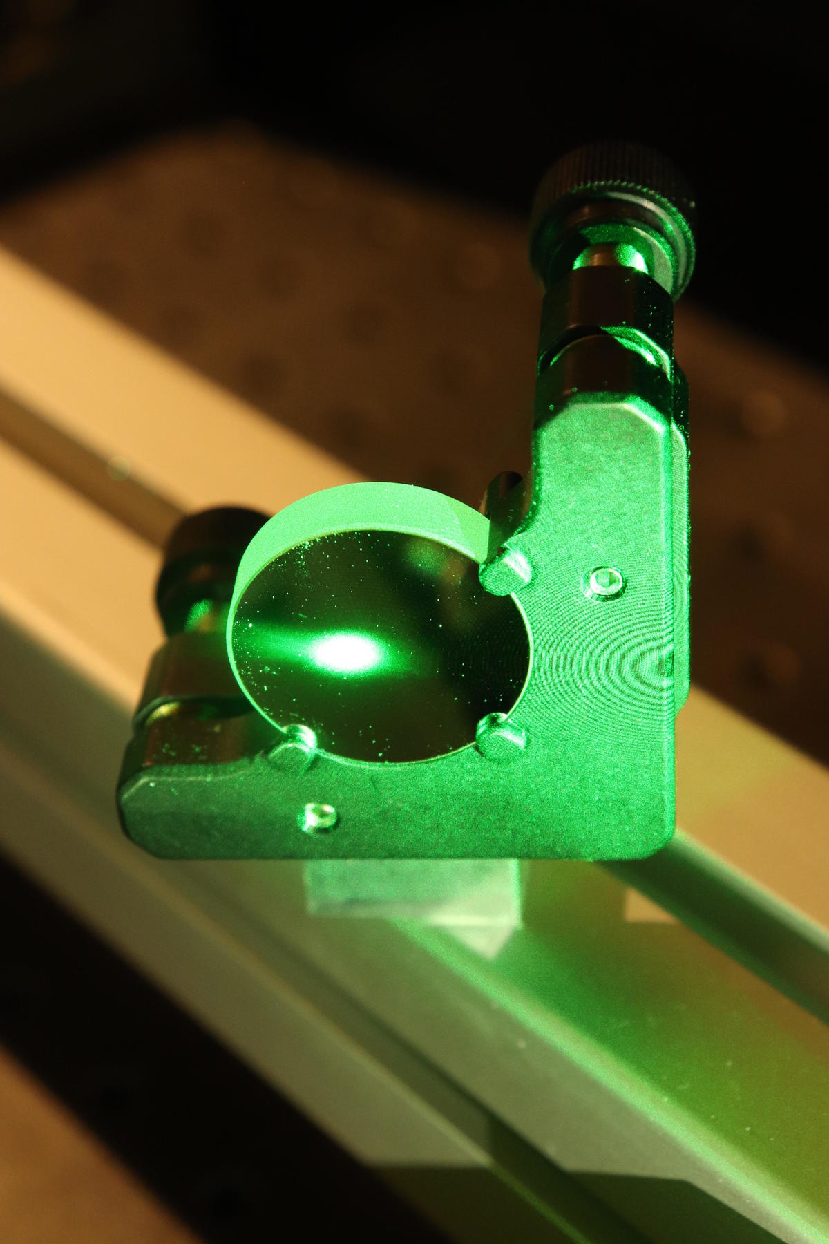 DiodenlaserHalbleiterbauteil, das Laserstrahlung erzeugt. Das Licht aus der Laserdiode wird meist mit einer Optik kollimiert oder fokussiert. Ohne Kollimationsoptik läuft der Strahl mit einer Divergenz von ca. 5°- 20° kegelförmig auseinander. Die Divergenz ist senkrecht zum pn-Übergang (siehe Diode) meist deutlich größer als parallel dazu (überprüfen, Bild).DPSS-LaserKurz für Diode-Pumped-Solid-State-Laser (Diodengepumpter Festkörperlaser). DPSS-Laser erzeugen Laser-Strahlung in einem Kristall (typischerweise einem Neodym-dotierten Yttrium-Aluminium-Granat-Kristall (NdYAG)), der mit der Strahlung einer Laserdiode gepumpt wird. Der NdYAG-Kristall des im Bild gezeigten Compass 215M von Coherent wird bei 808 nm (Infrarot) gepumpt und emittiert mit 1064 nm (Infrarot). Die 1064 nm-Frequenzlinie des NdYAG-Kristalls wird anschließend mithilfe eines Kaliumtitanylphosphat-Kristalls (KTP) frequenzverdoppelt, sodass sich die vom Laser emittierte Wellenlänge auf 532 nm (grün) halbiert.
