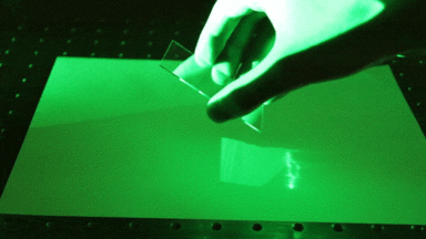Da t die Zeit angibt, die das Polymer benötigt, damit die Reaktion im Film startet, sollte bei der Aufnahme länger als die ermittelte Zeit belichtet werden. Eine Belichtungszeit von 120 Sekunden ist in diesem Beispiel ausreichend. Im Gegensatz zu Transmissionshologrammen kann bei Reflexionshologrammen nicht "überbelichtet" werden. Das heißt, dass das geschriebene Hologramm bei der Aufnahme nach einer bestimmten Zeit sein Helligkeitsmaximum erreicht und bei zusätzlicher Belichtung weder heller noch dunkler wird, sofern der Aufbau stabil bleibt. Vor der Entnahme des Films aus der Verpackung sollte der Raum vollständig abgedunkelt sein. Mit einer schwachen gelben LED kann die Arbeitsfläche für die Befestigung der Filmplatte beleuchtet werden, da das Filmmaterial auf diese Wellenlängen am unempfindlichsten reagiert. Der Laser wird manuell oder mit Hilfe des Shutters gesperrt. Jetzt kann die Filmplatte aus der Verpackung entnommen und mit der Filmseite zum Objekt hin auf den Filmhalter aufgelegt werden. Die Filmplatte wird bei der Aufnahme mit dem Film zum Objekt platziert, damit es später durch die Glasplatte hindurch betrachtet wird. So ist es z.B. in einem Rahmen geschützt. Zudem ergeben sich die in dieser Anleitung erläuterten Geometrien der Hologramme und des einfallenden Lichts bei der Belichtung und Rekonstruktion aus dieser Anordnung. Mithilfe der Klammern wird die Filmplatte nun für die Aufnahme fixiert. Das Objekt kann entweder am Filmhalter fixiert oder in einer stabilen Lage direkt auf die Filmplatte aufgelegt werden. Durch leichtes Klopfen mit dem Finger auf das Objekt und die Filmplatte kann noch einmal sichergestellt werden, dass beide ohne Spiel aufliegen und sich später bei der Aufnahme nicht bewegen. Beim Klopfen sollte kein Klappern der Platte zu hören sein. Und nun zur eigentlichen Aufnahme...Nun sollten wenige Minuten abgewartet werden, bis sich Schwingungen und Luftunruhen im Raum gelegt haben. Danach kann der Shutter geöffnet und der Film für die ermittelte Zeit belichtet werden. Anschließend wird der Strahl wieder gesperrt. Der Film ist nun belichtet und kann entnommen werden. Da keine Entwicklung des Polymers nötig ist, kann auch das Licht wieder eingeschaltet werden. Das Polymer muss nun einige Zeit im Tages- oder Weißlicht zur Fixierung bleichen, bis das Hologramm mit seiner gesamten Helligkeit hervortritt. Sprüht man das Hologramm nach der Aufnahme auf der Filmseite mit einer dünnen Schicht aus schwarzem Lack ein, wird der Kontrast noch einmal gesteigert. Das Hologramm wirkt umso schärfer, je punktförmiger die rekonstruierende Lichtquelle ist. Besonders gut eignen sich hierfür LEDs oder Dioden-Laser mit passender Wellenlänge. Bevor das Hologramm im Laser-Licht rekonstruiert wird, sollte das Polymer aber vollständig ausgebleicht sein, da der Laser sonst wieder Belichtungsprozesse im Film starten könnte. (ph 2022) |