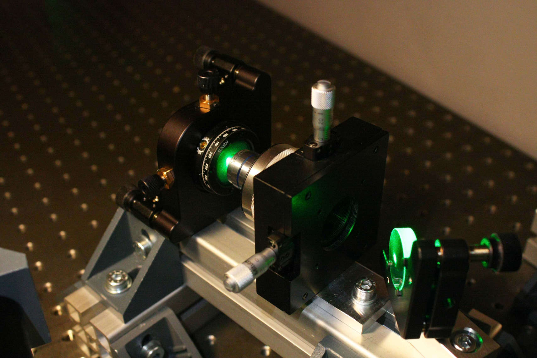 Für saubere Hologramme: Den Raumfilter einstellenDamit der Laser die gesamte Filmplatte und das Objekt beleuchten kann, muss er mithilfe einer Linse aufgeweitet werden. Dafür eignen sich Mikroskopobjektive mit dem Vergrößerungsfaktor um die x40. Durch Verunreinigungen und Imperfektionen der Optiken entstehen jedoch Artefakte im aufgeweiteten Strahl, die für eine saubere Ausleuchtung des Films und eine gute Qualität der Hologramme herausgefiltert werden müssen. Dafür wird ein Pinhole im Fokus des Mikroskopobjektivs platziert, das alle Strahlen, die nicht exakt durch den Fokus des Mikroskopobjektivs laufen, herausfiltert. Die Kombination aus Aufweitung und Pinhole bezeichnet man als Raumfilter. Für die einfache Justage des Raumfilters wird das Mikroskopobjektiv an einer X/Y/Z-Verstellung montiert. Das Pinhole sollte in zwei Achsen verstellbar sein. Bevor der Raumfilter eingestellt wird, sollten zuerst der Strahl und das Mikroskopobjektiv so justiert werden, dass der aufgeweitete Strahl die gesamte Filmplatte möglichst gleichmäßig ausleuchtet. Danach wird das Pinhole einige Millimeter hinter dem Fokus der Aufweitungsoptik montiert. Mit einem Stück Pappe, das etwa 30 cm hinter dem Pinhole aufgestellt wird, kann die Strahlqualität kontrolliert werden. Um einen sauberen Strahl zu erhalten, wird jetzt langsam und in sehr kleinen Schritten der Abstand zwischen Aufweitung und Pinhole verringert, bis das Pinhole im Fokus der Aufweitung liegt. Nach jedem Schritt korrigiert man dabei die Justage des Pinholes in beiden Achsen, sodass der Strahl nicht "verloren geht" und durch das Zentrum des Pinholes verläuft. Ist auf der Pappe eine kreisförmige homogene Ausleuchtung ohne Artefakte wie etwa Beugungsmuster von Staubkörnern zu sehen, ist der Raumfilter korrekt eingestellt. Eine dataillierte Videoanleitung zur Einstellung des Raumfilters finden Sie hier (wird nachgeliefert). Mit der Kombination der beiden Laserspiegel vor dem Raumfilter kann der Einfallswinkel des Laser-Strahls in das Mikroskopobjektiv eingestellt werden. Mit dem ersten Spiegel kann die Richtung des Strahls verändert werden, während der zweite Spiegel den Strahl wieder parallel zur Arbeitsplatte laufen lässt. Ein positiver Nebeneffekt dieser "Strahlwiege" über die beiden Spiegel ist außerdem, dass nicht alle Optiken in einer Reihe aufgebaut werden müssen und dadurch mehr Raum zwischen Aufweitung und Filmhalter gewonnen werden kann, sodass der Lichtkegel ausreichend divergieren kann, um die gesamte Filmplatte auszuleuchten.