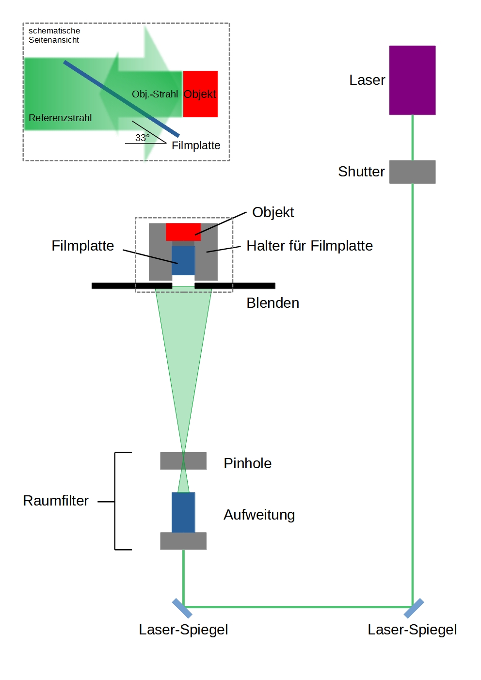 Die Skizze zeigt den von mir verwendeten Aufbau für Reflexionshologramme. Im ersten Schritt des Aufbaus wird der Laser-Strahl so justiert, dass er möglichst parallel zum Holographie-Tisch läuft, damit alle optischen Komponenten in der gleichen Höhe aufgebaut werden können. Mit einem Zollstock kann kontrolliert werden, ob der Strahl an verschiedenen Punkten im Laufweg die gleiche Höhe über dem Tisch hat. Ich habe einen Abstand von 130 mm gewählt. Wichtig für die Qualität der Hologramme ist, dass die Polarisation des Lasers, wenn er auf die Filmplatte trifft, vertikal zum Holographie-Tisch gerichtet ist. Für die Bestimmung der Polarisation eignet sich ein Polarisationsfilter. Gegebenenfalls muss die Polarisation mit einer λ/2-Platte korrigiert werden. Für Einstellung der λ/2-Platte eignen sich Drehhalter. Alternativ kann auch der gesamte Laser so um die Horizontalachse gedreht werden, dass die Polarisation stimmt. Einen Objekt- und Filmhalter konstruierenFür eine erfolgreiche Aufnahme ist die Konstruktion eines stabilen Filmhalters nötig, auf dem die Filmplatte und das holographierte Objekt befestigt werden können. Wichtig ist dabei, dass die Filmplatte auf dem Filmhalter im Brewster-Winkel aufliegt. Hier kommt die eben erwähnte Polarisation ins Spiel. Trifft das vertikal zur Tischplatte polarisierte Licht (p-polarisiert) auf die Filmplatte, minimiert der Brewster-Winkel Reflexionen innerhalb der Filmplatte. Diese sind bei der Rekonstruktion sichtbar und vermindern die Qualität des Hologramms. Der Brewster-Winkel beträgt 33° zwischen Arbeitsfläche und Filmplatte.